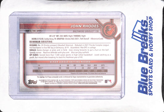 2022 Bowman Chrome - John Rhodes - Blue Autograph - 121/150 - Baltimore Orioles - Baseball - #CPA-JR
