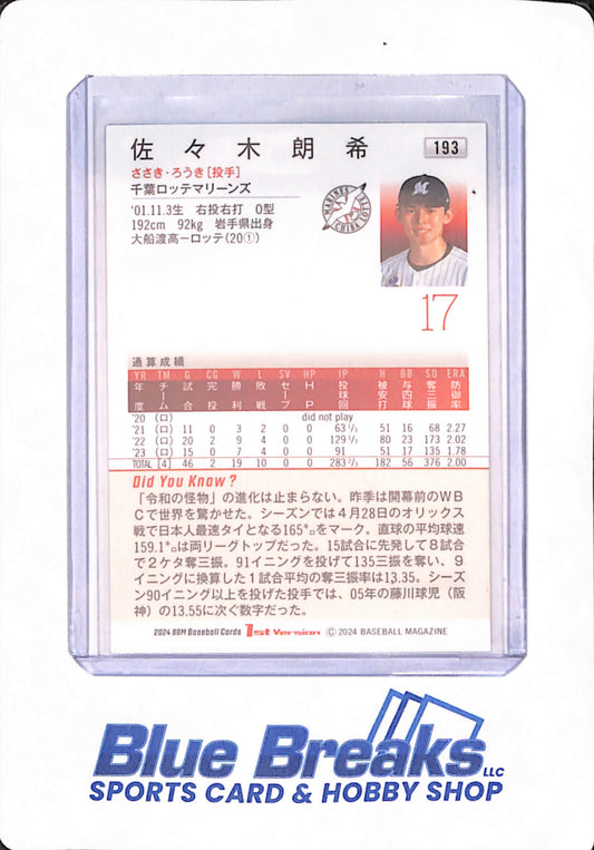 2024 BBM Baseball Cards 1st Version - Roki Sasaki - Baseball - Chiba Lotte Marines - Japanese - #193