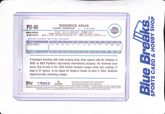 2024 Topps Pro Debut - Roderick Arias - Tampa Tarpons - Baseball Autograph - #PD-80