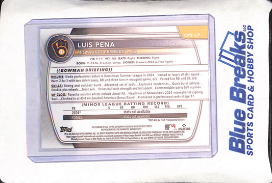 2025 Bowman Chrome Sapphire - Luis Pena - !st Bowman Autograph - 190/199 - Milwaukee Brewers - Baseball - #CPS-LP