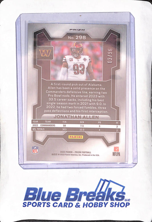 2023 Panini Prizm - Jonathan Allen - Blue Sparkle - 3/96 - Washington Commanders - Football - #298