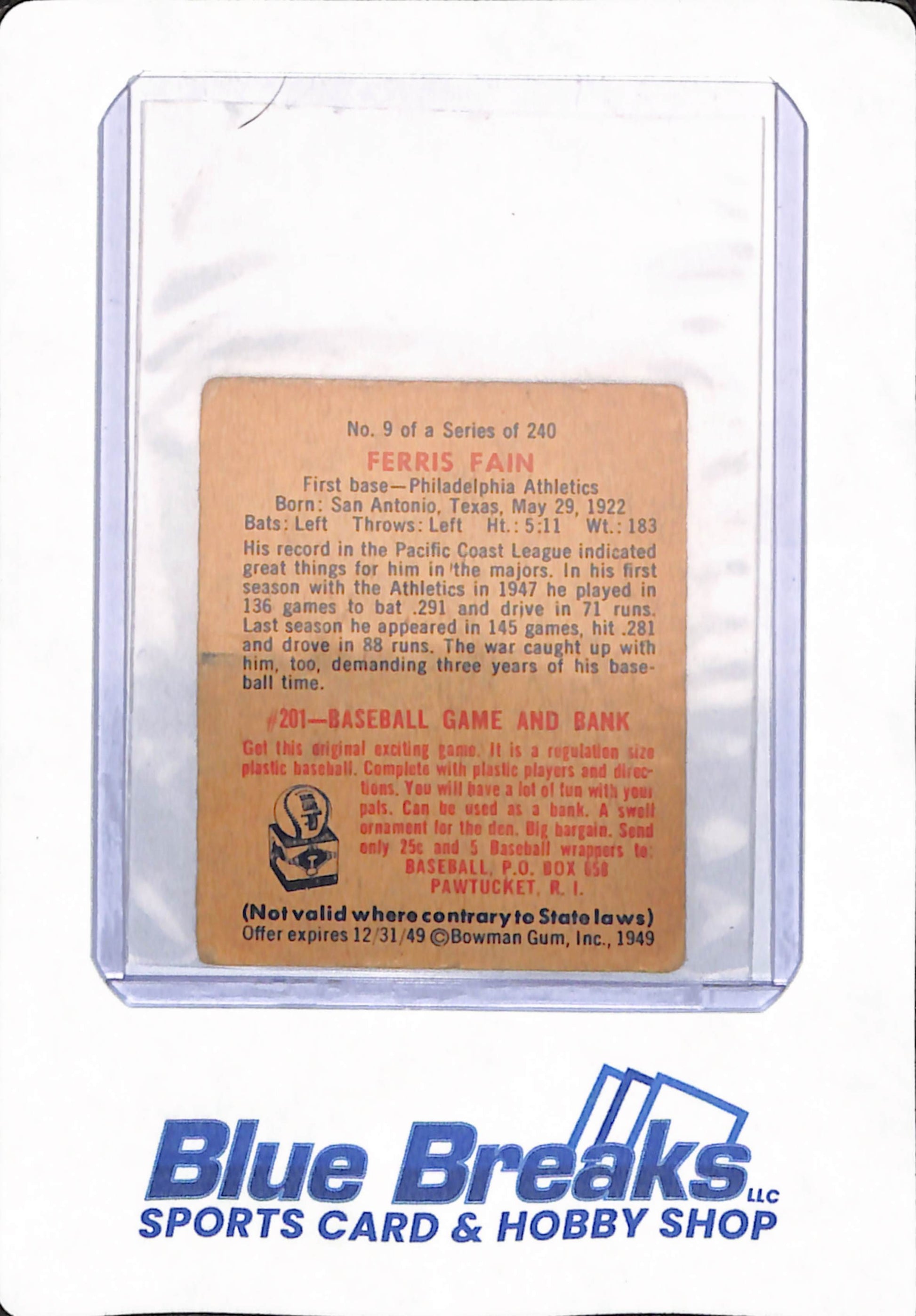 1949 Bowman - Ferris Fain - # 9 - Baseball - Philadelphia Athletics