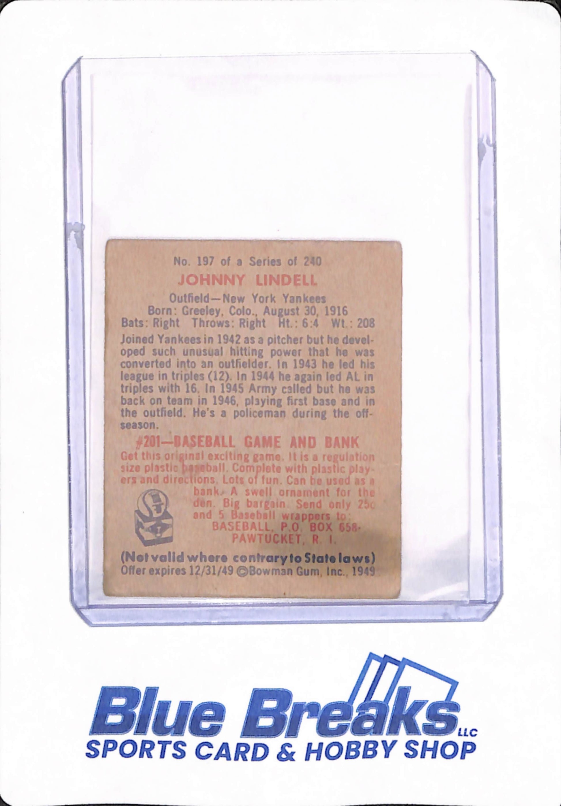 1949 Bowman - Johnny Lindell - # 197 - Baseball - New York Yankees
