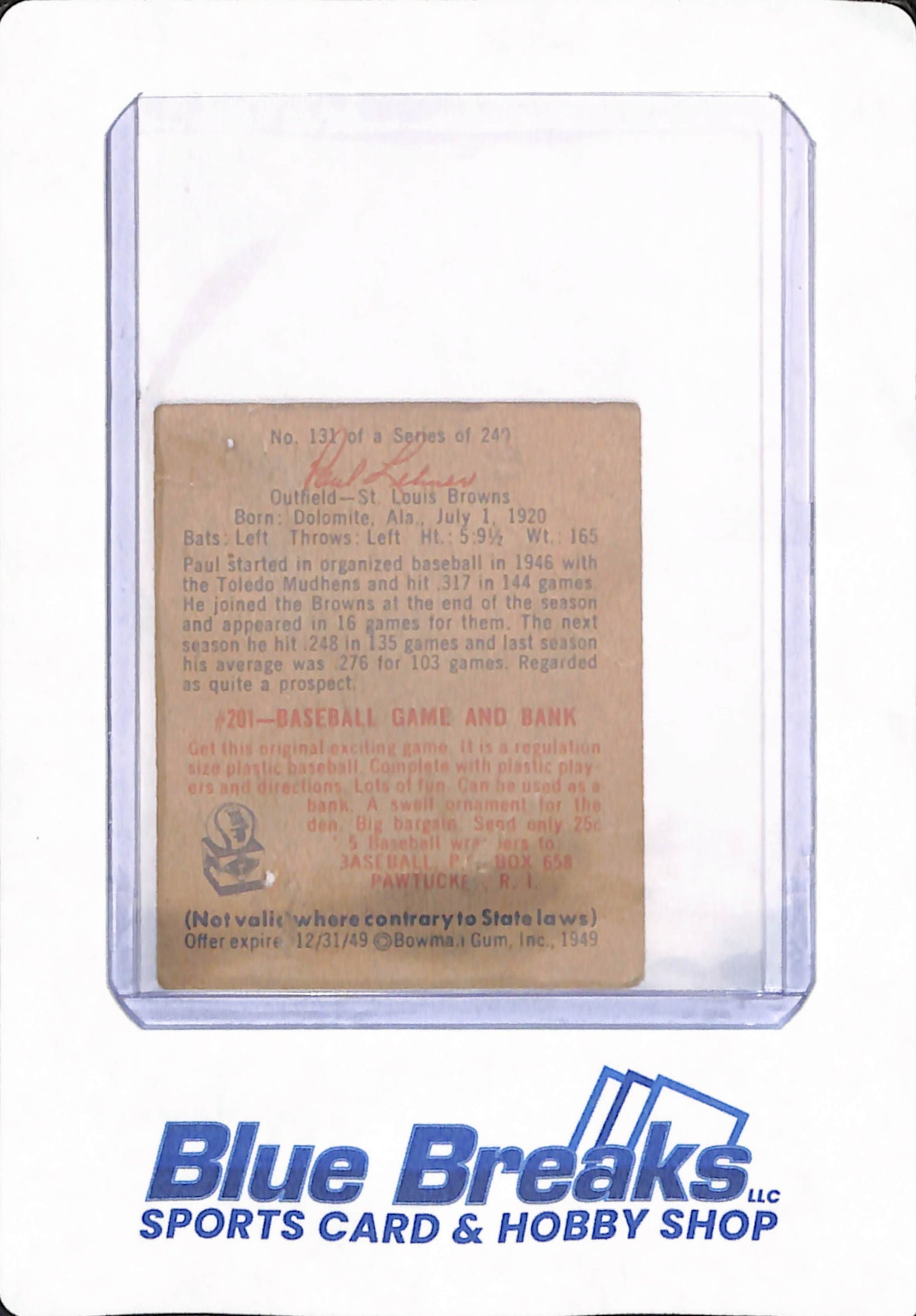 1949 Bowman - Paul Lehner - # 131 - Baseball - St Louis Browns