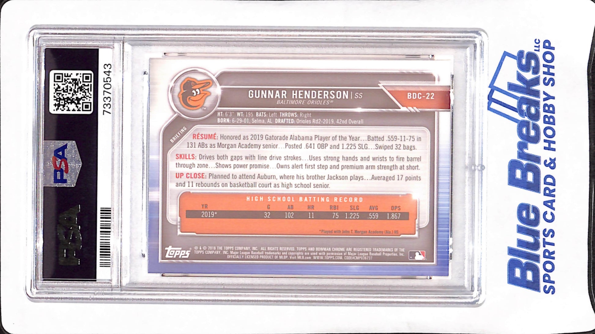 2019 Bowman Draft Chrome - Gunnar Henderson - 1st Bowman - Baltimore Orioles - Baseball - PSA 10 - #BDC22