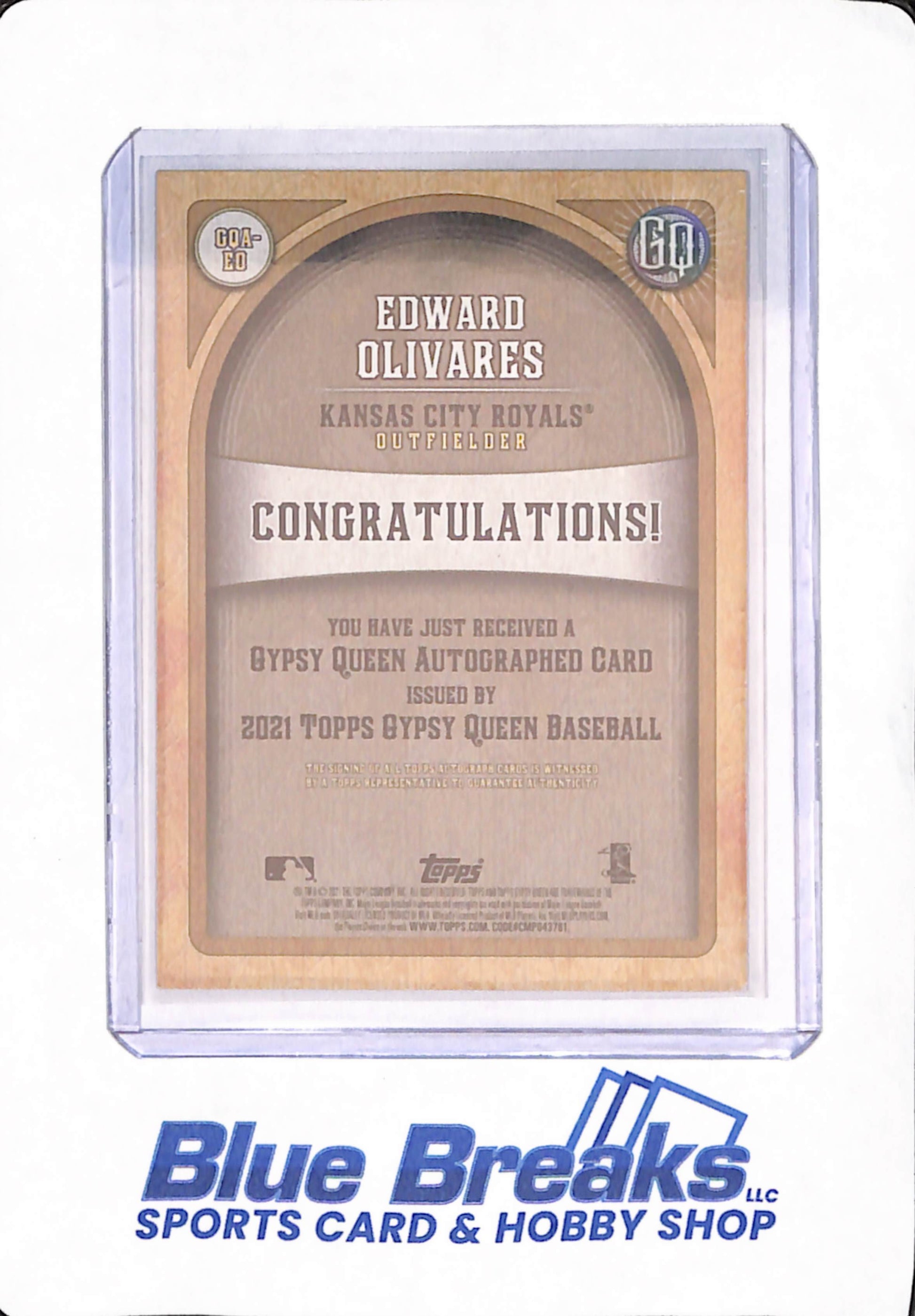 Get your hands on this limited edition 2021 Topps Gypsy Queen baseball card featuring the talented rookie Edward Olivares from the Kansas City Royals. This autographed card also includes the player's team name script, making it a must-have for any collector. Don't miss out on adding this unique and valuable card to your collection!