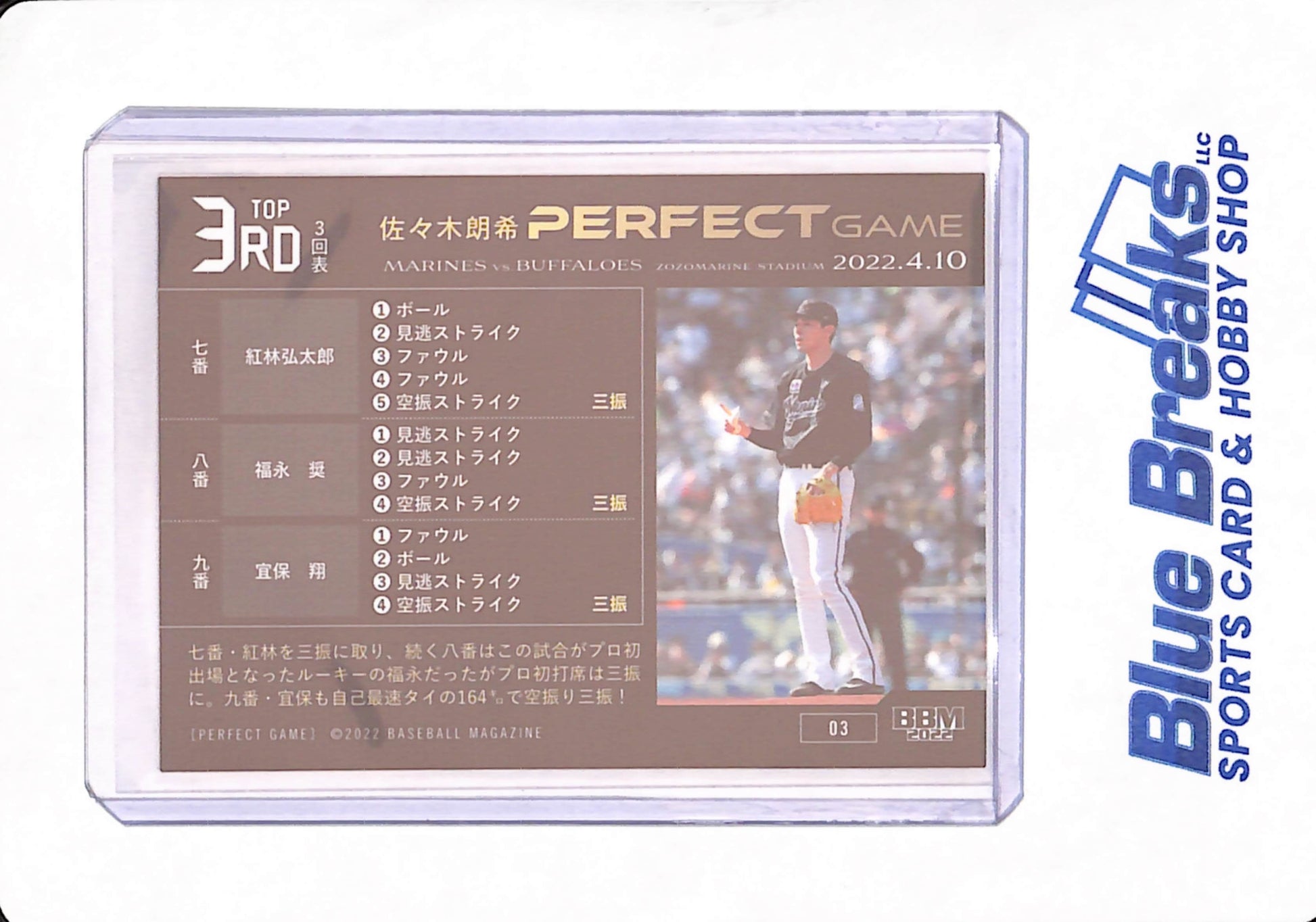 2022 BBM Perfect Game - Roki Sasaki - Baseball - Chiba Lotte Marines - Japanese - Zozomarine Stadium - Top 3rd - #3