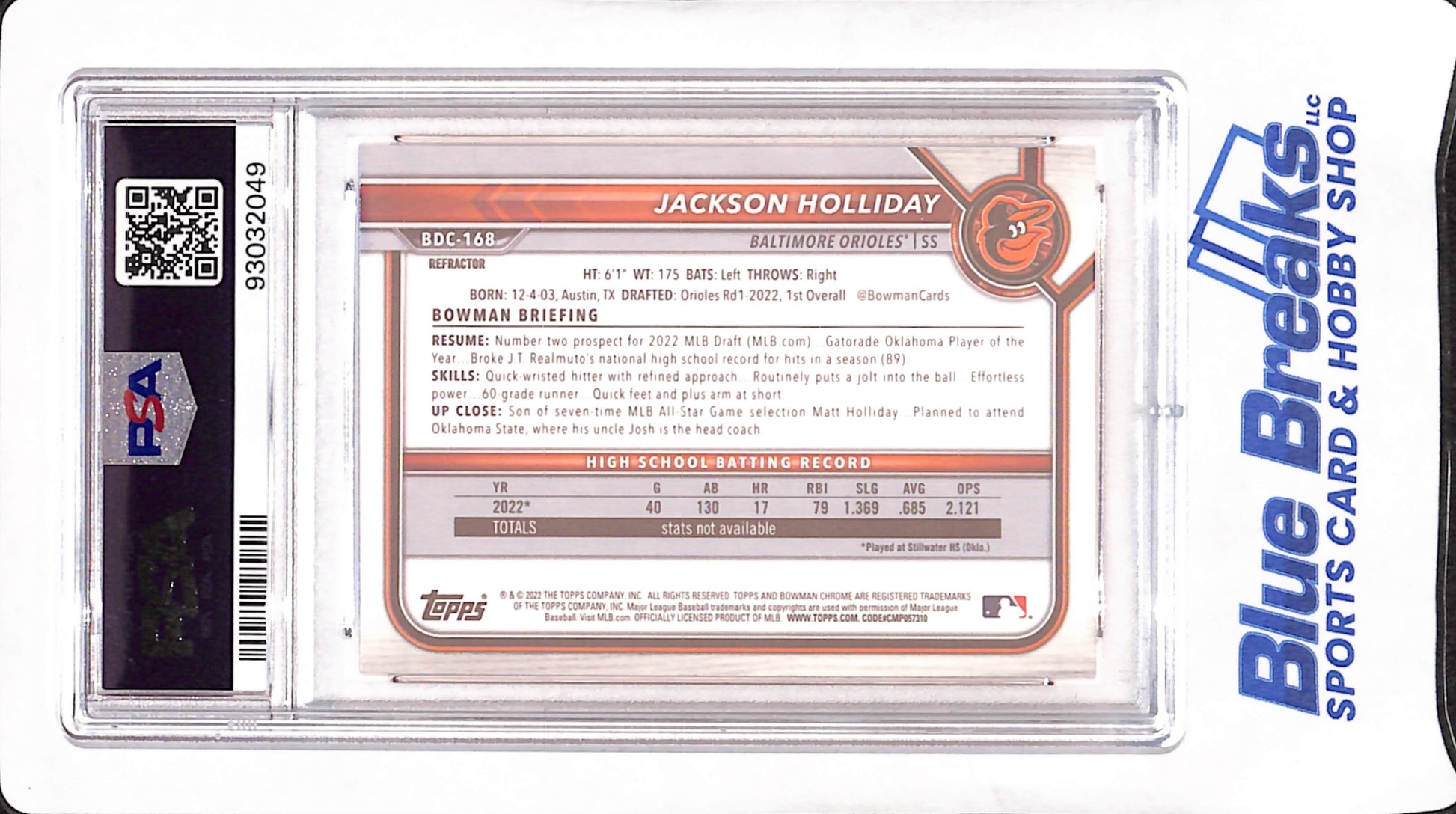 2022 Bowman Draft Chrome - Jackson Holliday - 1st Bowman Refractor - PSA 9 - Baltimore Orioles - Baseball - #BDC168