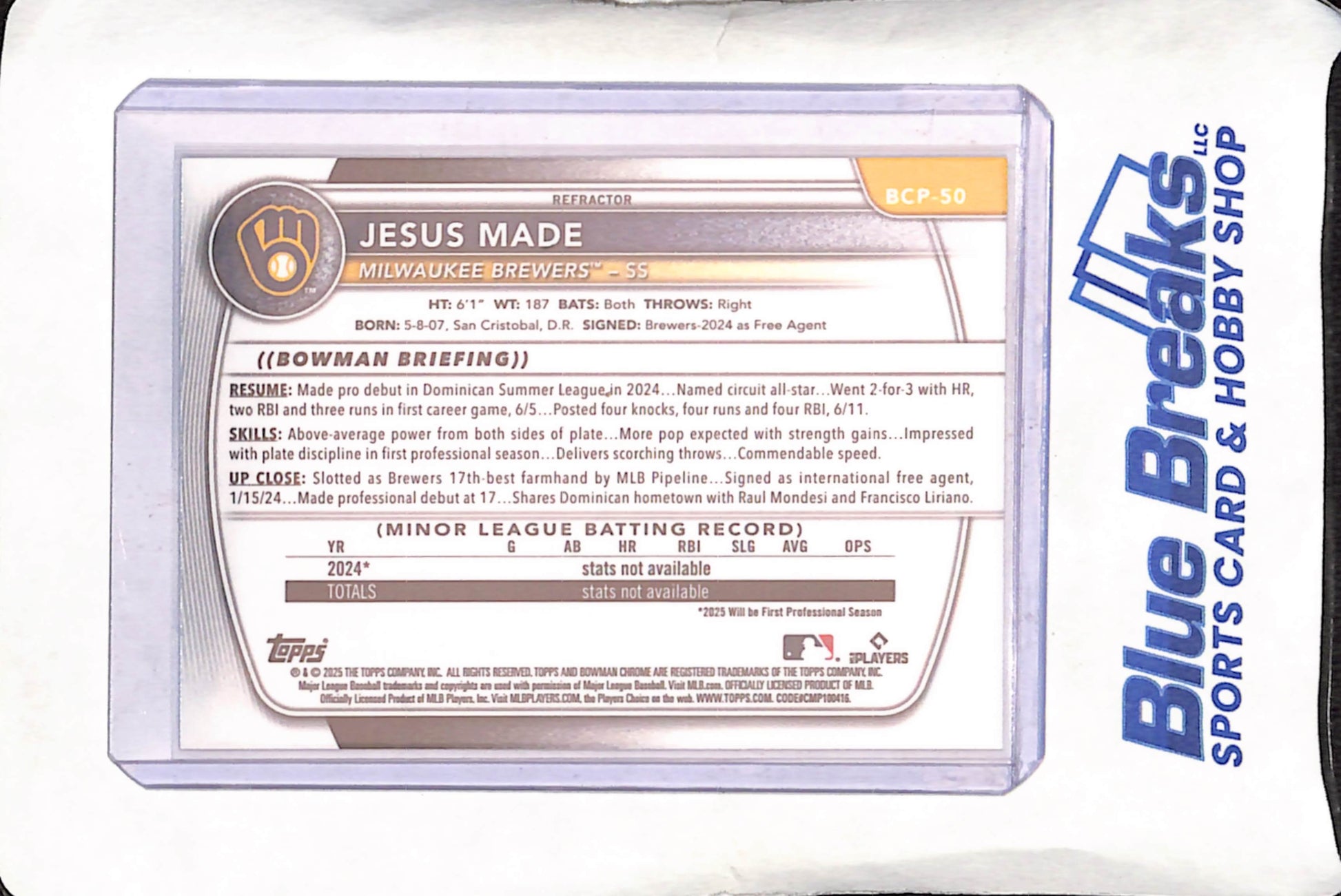 2025 Bowman Chrome - Jesus Made - 1st Bowman Refractor - 110/499 - Milwaukee Brewers - Baseball - #BCP-50