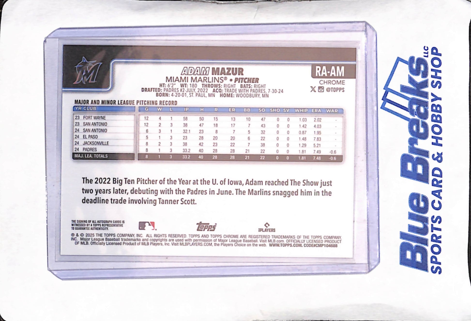 2025 Topps Chrome - Adam Mazur - Purple Sparkle RC Autograph - 91/299 - Miami Marlins - Baseball - #RA-AM