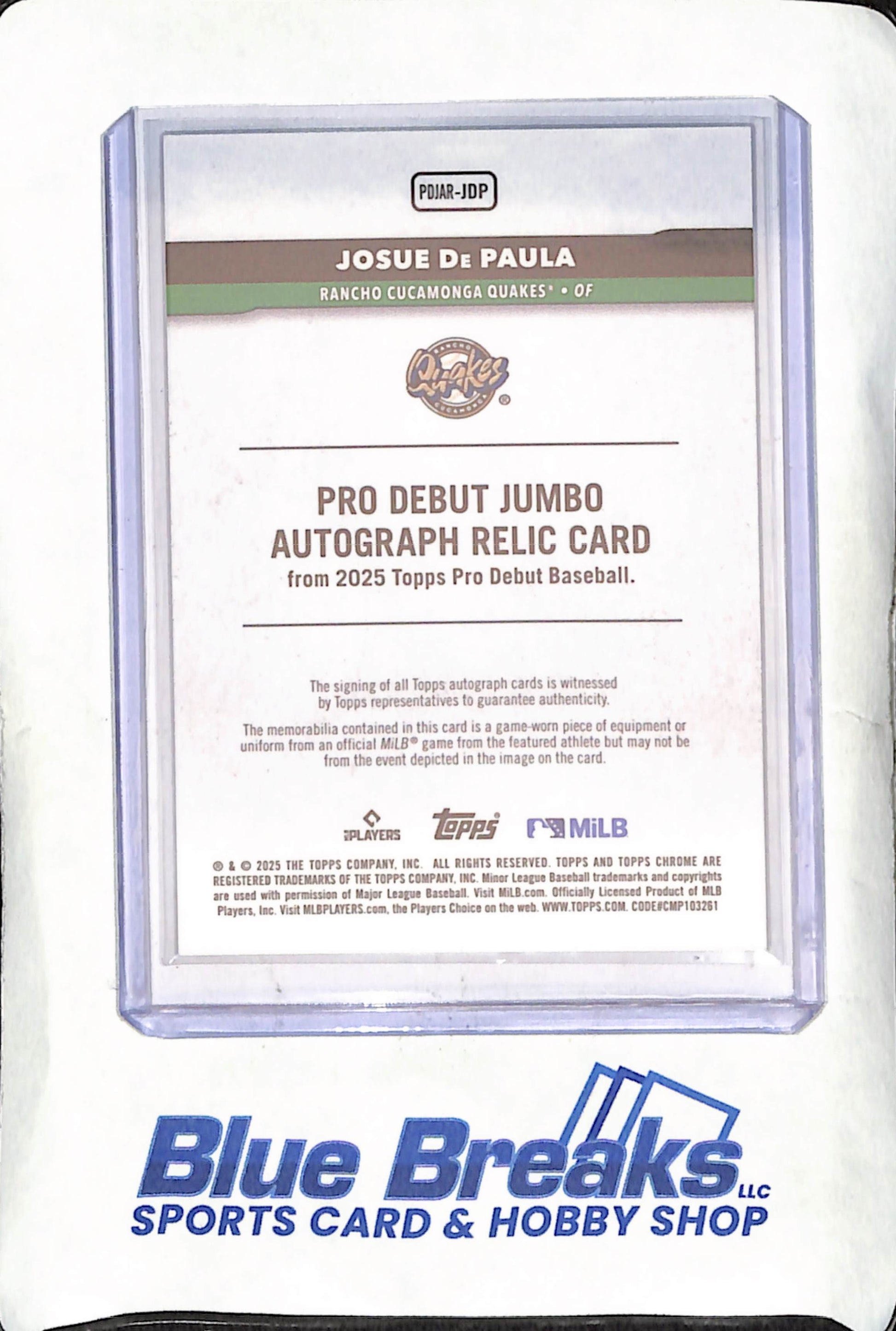 2025 Topps Pro Debut - Josue De Paula - Chrome Autograph Game-used Material - 66/150 - Rancho Cucamonga Quakes - Baseball - #PDJAR-JDP