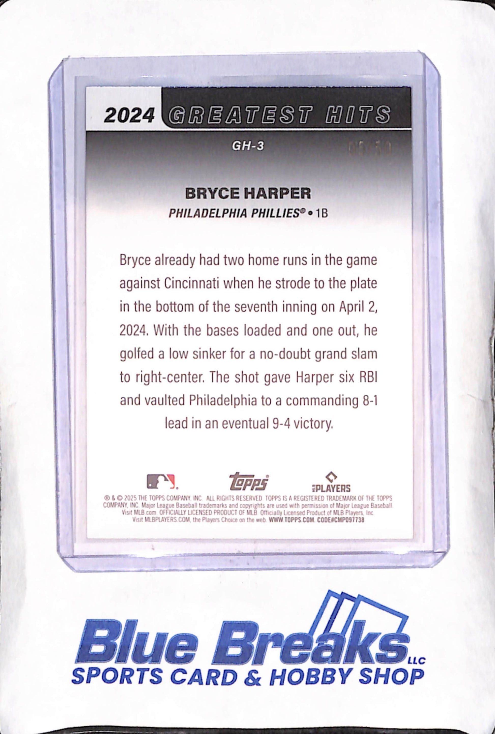 2025 Topps Series One - Bryce Harper - 2024 Greatest Hits 4/2/24 Gold - Grand Slam for 3rd HR of the Game - 5/50 - Philadelphia Phillies - Baseball - #GH-3